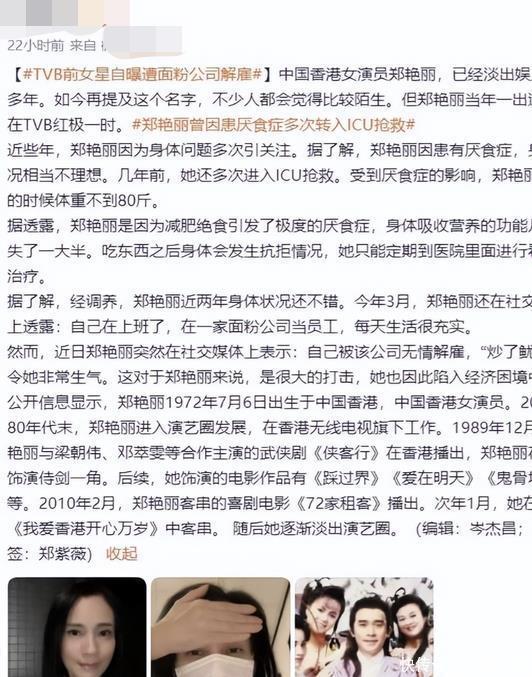 面对顾客“这不是那个艳星吗”的窃窃私语和偷拍,她只能低头默默擦桌子。 不过,生活的磨难并没有放过她。 2020年,为了重返荧幕尝试节食减肥的郑艳丽患上严重厌食症,体重暴跌至39.5斤。 她多次被送进ICU抢救,手臂布满抽血针孔,医生警告“再晚半小时人就没了”,她却还在担心医药费太贵。